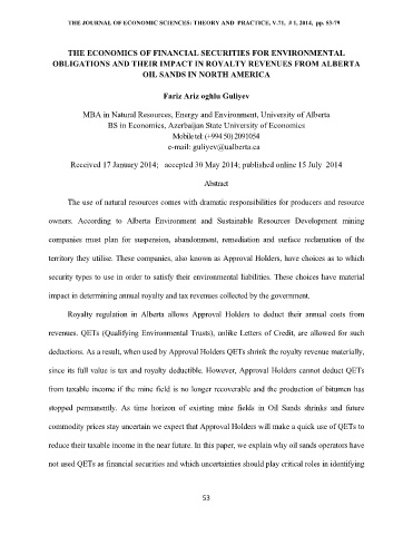 THE JOURNAL OF ECONOMIC SCIENCES: THEORY AND PRACTICE, V.71, # 1, 2014, pp. 53-79