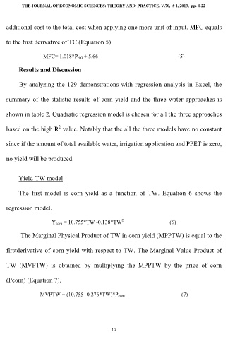 firstderivative of corn yield with respect to TW. The Marginal Value Product of