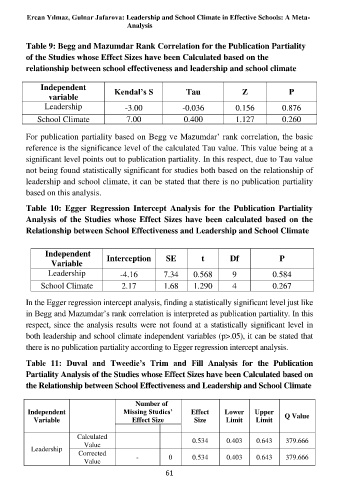 Table 10: Egger Regression Intercept Analysis for the Publication Partiality
