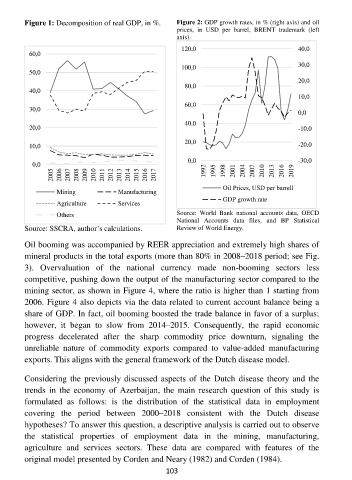 Figure 1: Decomposition of real GDP, in %. Figure 2: GDP growth rates, in % (right axis) and oil